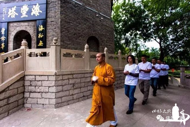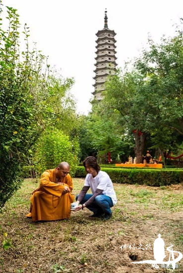 当天上午九时,恒顺法师在无棣古城迎恩门引领佛缘之路一行走进千年古刹大觉寺,在海丰塔前亲手采取圣土。