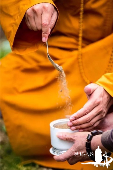 和以往不同的是,大觉寺方丈恒顺法师不仅亲自取土,更是在大雄宝殿,携弟子为佛缘之路一路收集的圣土加持洒净。