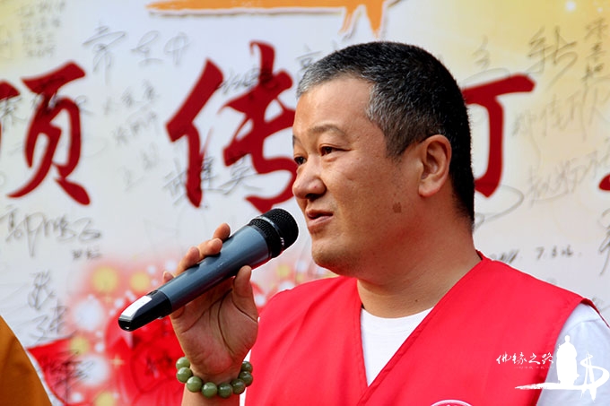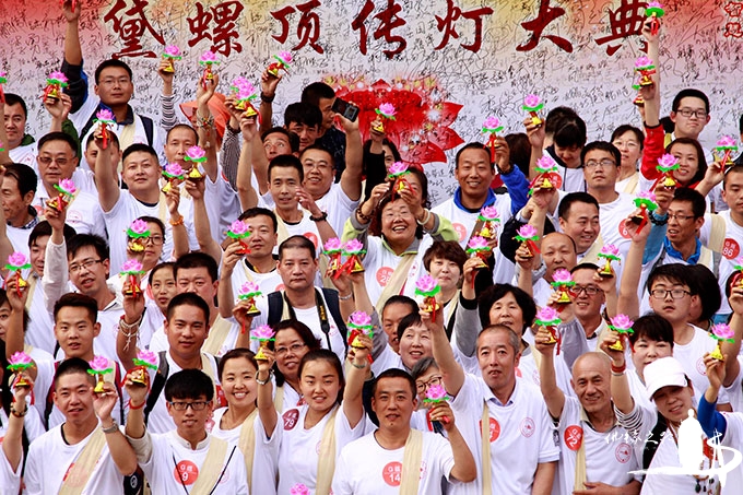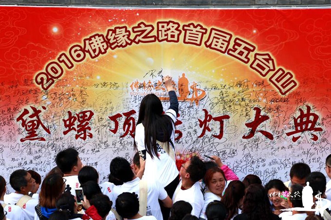 18点,“佛缘之路——五台山黛螺顶首届传灯大典”启动仪式,在黛螺顶下面的一所小学广场举行。排列整齐的千名志愿者,身穿印有“佛缘之路——五台山黛螺顶首届传灯大典”标志的白色特制T恤,现场显得庄严殊胜。在五台山佛教协会会长、五台山黛螺顶昌善大和尚和佛缘之路发起人李进致辞后,大家争相在传灯背板上签名。昌善大和尚对佛缘之路走进五台山,举行首届传灯大典表示赞叹和支持,希望大家在文殊菩萨的道场,通过“灯灯相传、传灯无尽”来传递美好愿望,共同祈愿世界和平、国泰民安。