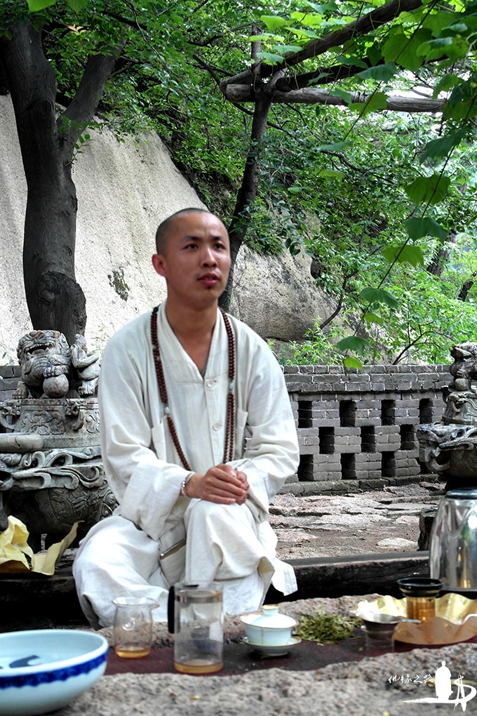 随行的龙泉寺照见师父笑着说,这里就是他每天必修的禅茶课。