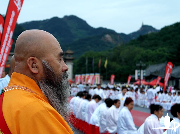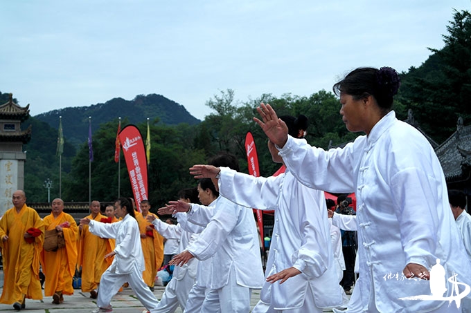 但大雨并没有影响法会的如期进行,8点左右,参加本次法会的各级党政领导,诸山长老、高僧大德及护法居士陆续到来,偌大的广场顿时变得人潮涌动。在诸山长老、高僧大德的准备阶段,由几百人组成的太极拳表演队,先给参加法会的人们带来一场美味的“早餐”。