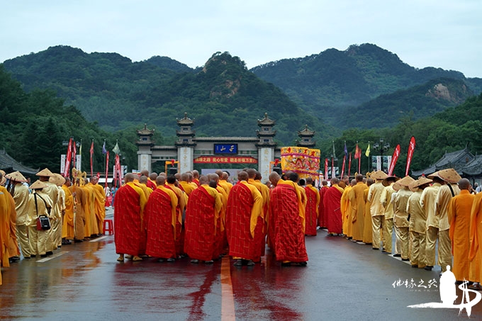 早上六点半,现场已有“佛缘之路”工作人员及千山景区管委会的管理人员在现场忙碌。小到一个机位的安置,大到高僧主法现场的布置,都显得有条不紊。但不利的是,从凌晨开始,大雨一直下个不停,给现场布置带来困难,也给后面的法会带来诸多不确定因素。